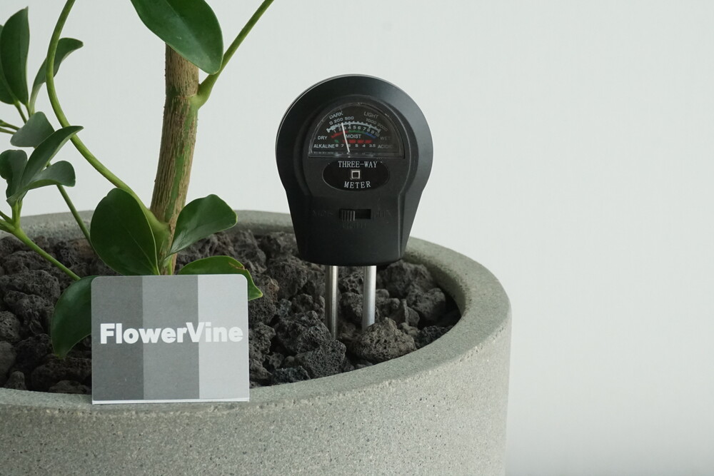 무동력 측정기를 이용하여 현재 화분 속 상태(수분, 산성도/일조량)를 체크해 볼 수 있습니다.
