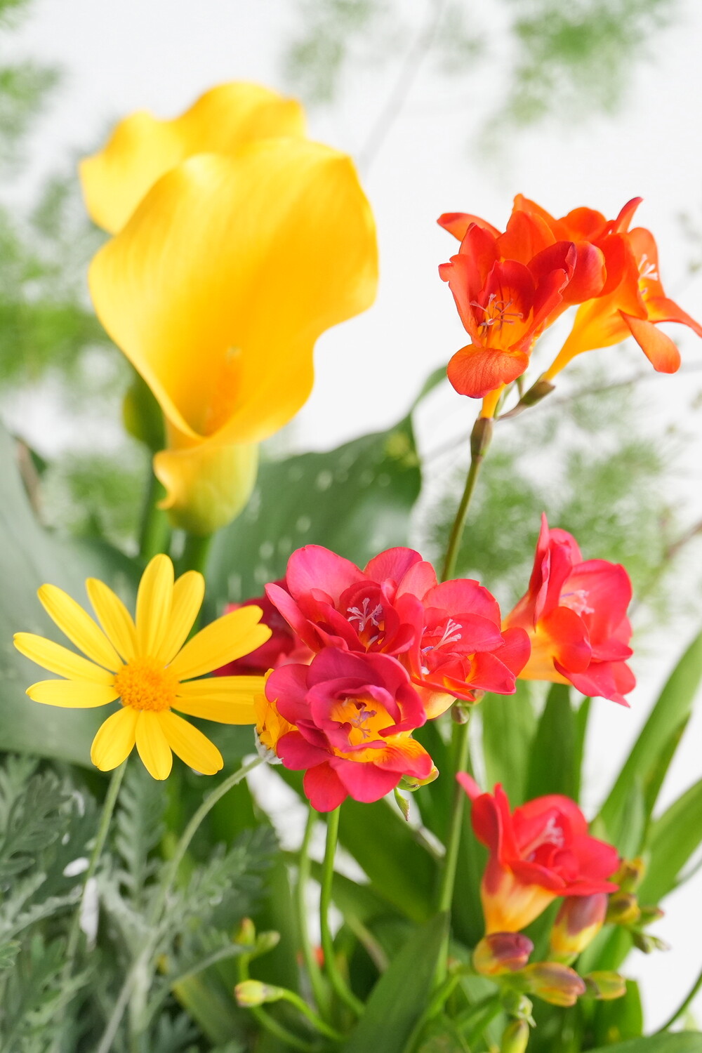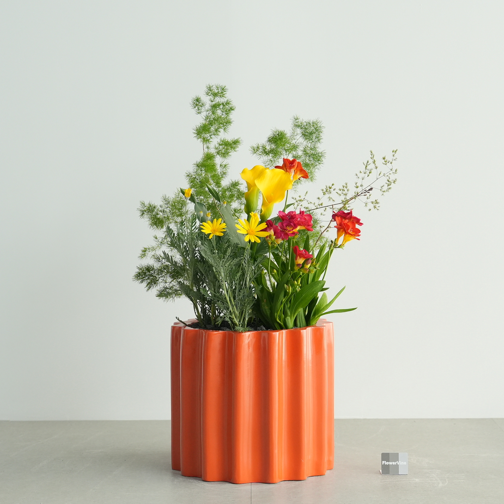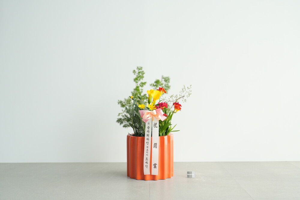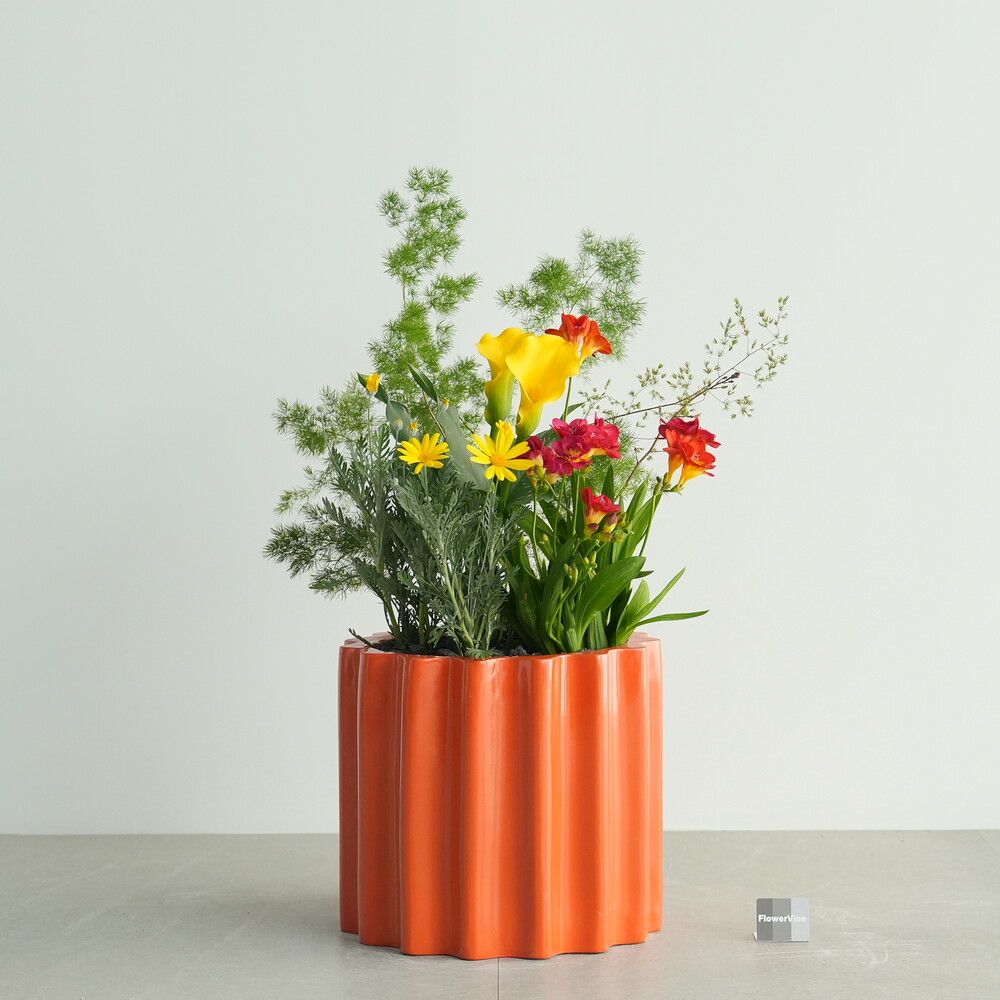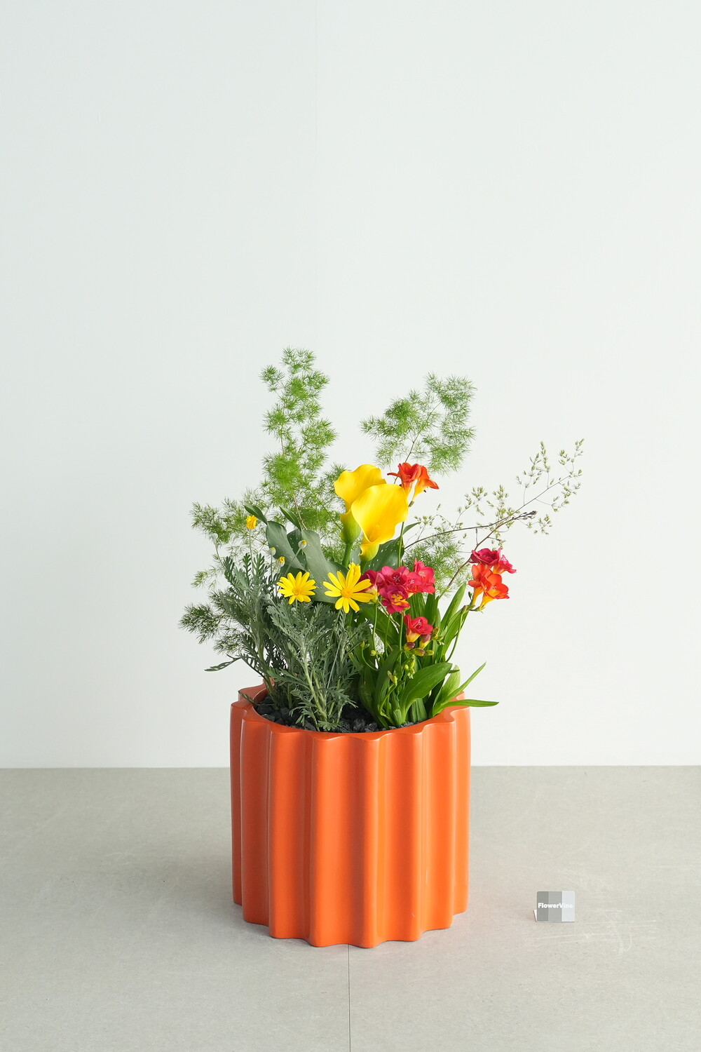 식물 : 카라, 후레지아, 유리호프스, 아스파라거스 미리오클라두스(주문시점에 따라 소재 변동 있습니다.) / 화분 : 옐로우 GY-2화분