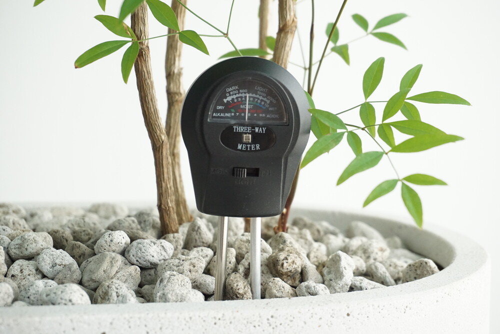 무동력 측정기를 이용하여 현재 화분 속 상태(수분, 산성도/일조량)를 체크해 볼 수 있습니다.
