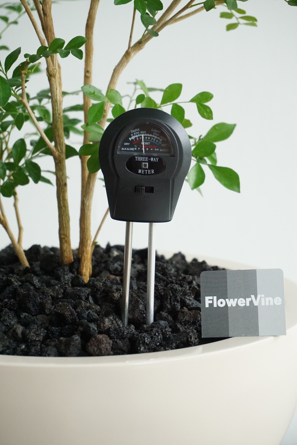 무동력 측정기를 이용하여 현재 화분 속 상태(수분, 산성도/일조량)를 체크해 볼 수 있습니다.