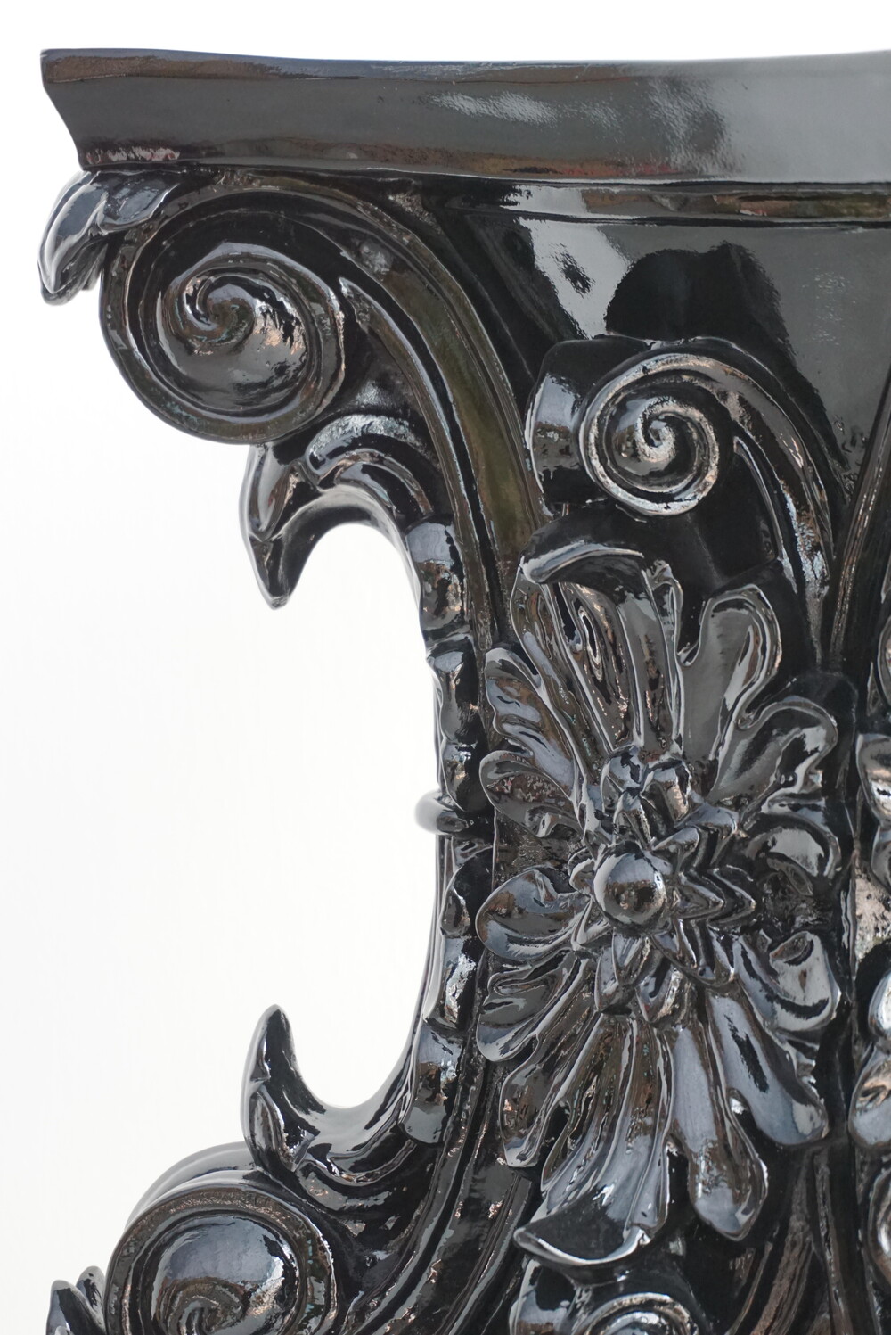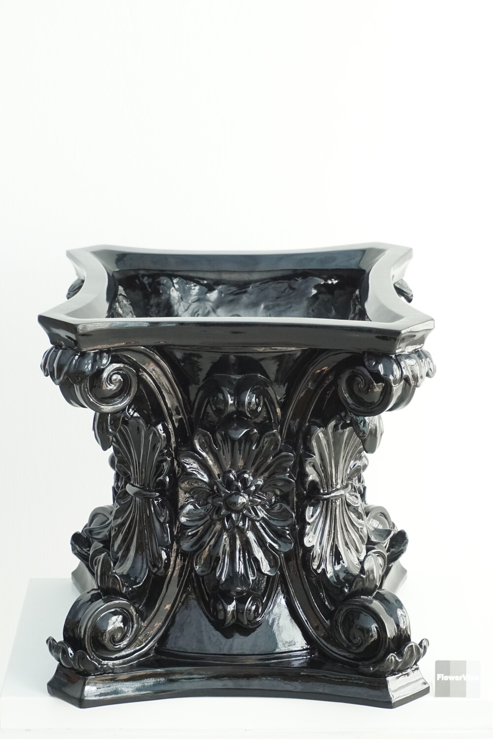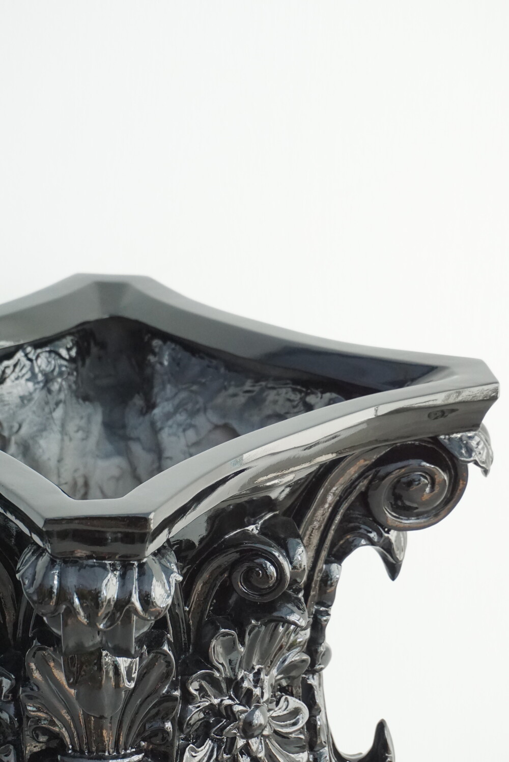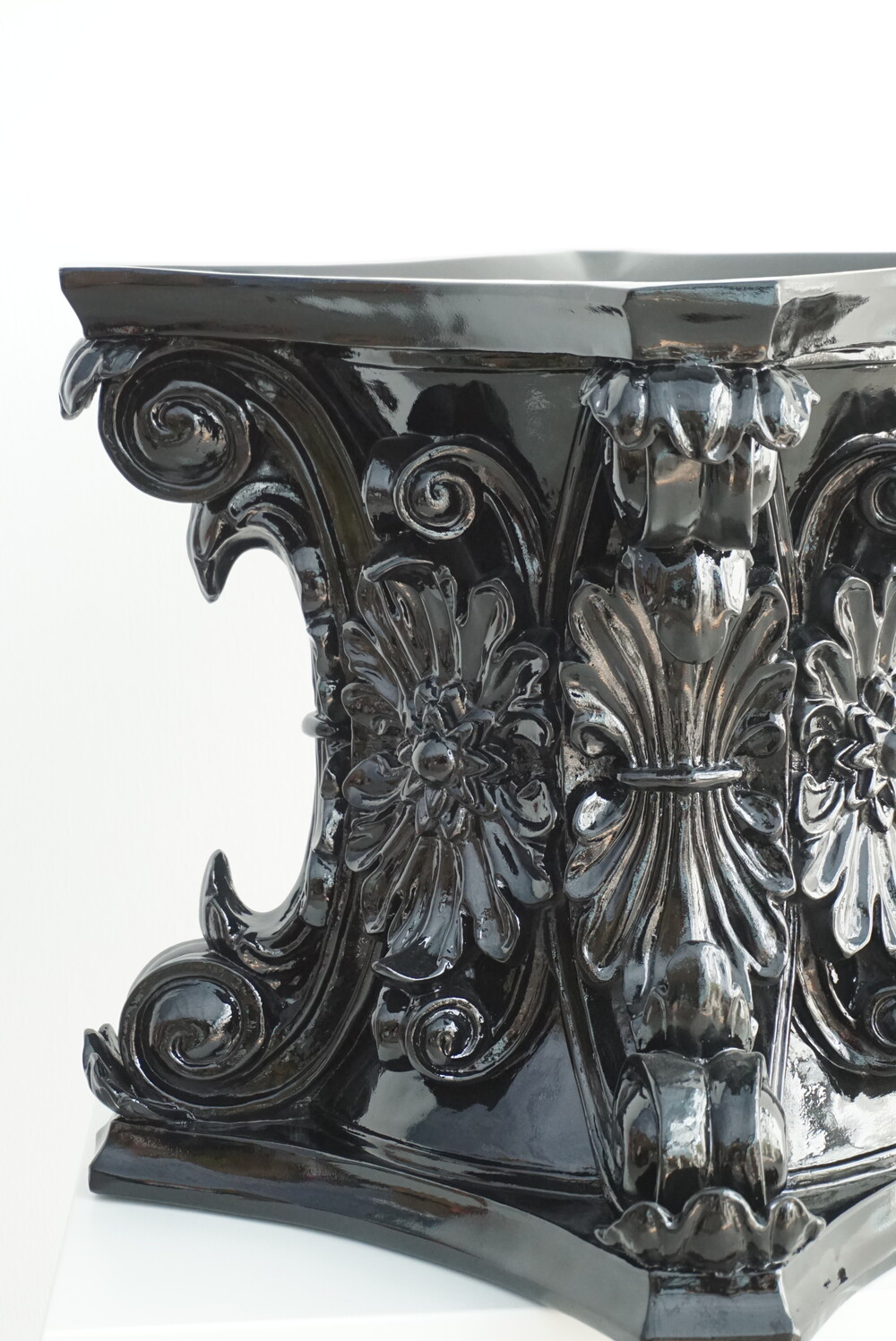 고대 로마 기둥 양식에서 영감을 받은 코린트 화분은 화려한 잎 장식과 정교한 곡선미를 그대로 담아냈습니다. 깊이감 있는 유광 블랙 마감으로 빛의 각도에 따라 조각의 디테일을 드라마틱하게 살려주며, 모던하고 럭셔리한 분위기를 완성합니다. 식물의 싱그러운 초록빛과 대비되는 강렬한 블랙의 조화는 여러분의 거실, 로비, 혹은 정원을 품격 있는 갤러리로 변화시킬 것입니다. 전통의 우아함과 현대의 시크함이 만난 특별한 오브제를 경험해 보세요.